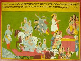 | Description / विवरण | Miniature painting based on Mahabharat - Shalya parva depicting Kritverma, Kripacharya and Aswathama searching Duryodhan and reached to the bank of the lake where Duryodhan hidden himself Ashwathama started crying on the bank of the lake and stand by seeing Pandavas coming towards the lake. By seeing Pandavas the women start mourning. |