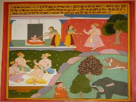 | Description / विवरण | Miniature painting based on Panchtantra depicting a story of loyal mongoose and a foolish lady. On top right she saw a killed snake and her child was playing start regretting for the mongoose whom she killed. Below right 4 males talking to each other and left below a man is telling the story to a tiger and an elephant. |