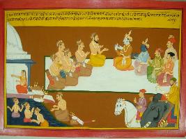 | Description / विवरण | Miniature painting based on Mahabharat - Vana parva depicting Pandavas are taking bath in river and Draupadi is taking fast and worshipping Shiv inside temple at right part Krishna with Balram and his Sardar come to meet Pandavas. They are depicting sitting and talking about Arjun s penance. |