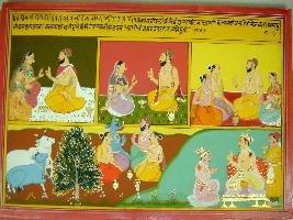 | Description / विवरण | Miniature painting based on Harivansha. The upper part is divided into three panels depicting a priest sitting with two women, a priest with a woman, a priest with a woman and two men. On the lower part, two cows near a tree, three sages and a demon sitting and talking, a king sitting with a man and an attendant. |