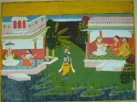 | Description / विवरण | Miniature painting based on Krishna charitra depicting sitting with a Brahman who telling something to him at right part. To its left, Krishna is shown standing outside the palace. At the left side, three men are shown sitting and discussing in palisade. |