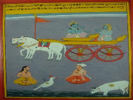 | Description / विवरण | Miniature painting based on Shri Bhagwat Gita. It depicts Krishna preaching Arjun the knowledge of Gita and telling him in everybody Anadi Nirgun Parmatma is present, and one who do not believe this decline soon. |