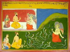 | Description / विवरण | Miniature painting based on Harivansha divided into two part. In the upper part, a king and Garuda are sitting with folded hands in front of a sage and a woman. In the lower part, Garuda is depicted eating the snakes, which are approaching the sage and the two females, sitting in front of him. |