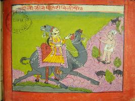 | Description / विवरण | Leaf from illustrated manuscript of Dhola Maru depicting Dhola sitting on a camel and met man half dresses and carrying a stick. This manuscript has 111 pages with 35 illustrations. |