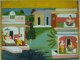 | Description / विवरण | Miniature painting based on Krishna charit depicting Kansa talking with a priest while in the other side Yashoda is seen and Balram is talking to her. |