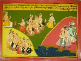 | Description / विवरण | Miniature painting based on Mahabharat - Vana parva depicting Janmejaya talking to Vaispayan and telling about Krishna and his folk meeting Pandavas at the upper left part. In rest of painting, Pandavas is shown sitting with Kashayap rishi and then leaving with Krishna with Balram. |