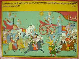 | Description / विवरण | Miniature painting based on Mahabharat - Shalya parva depicting Arjun and other Pandavas attacked Madriraj Shalya who run from the battle in the way a deer run to save its life from a tiger. |
