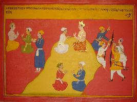 | Description / विवरण | Miniature painting based on Mahabharat - Bhishma parva depicting is shown talking to a man who is saying that the advice which include goddness for all is greater and the fight which is won through sacrifice is great. At the left part, men are shown fighting with each other. |
