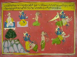 | Description / विवरण | Miniature painting based on Mahabharat - Udyam parva. It depicts Garuda is telling Indra that he used to carry Vishnu on his back, even Vishnu keep his flag on him. Then Indra tells him that he cannot even able to hold the weight of his one hand. |
