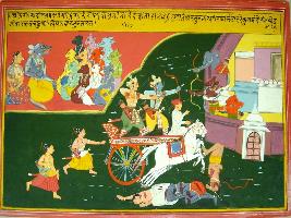 | Description / विवरण | Miniature painting based on Harivansha. On the top right part, demon Vaprachi is seated with his army. In the left part, war between demons and Indra along with Arjun is depicted. |