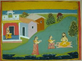 | Description / विवरण | Miniature painting based on Krishna charitra depicting a woman sitting in her palace at upper right part. At the lower left, a woman shown sitting in front of sage who sitting on deer skin. At the lower middle, She is shown bringing water from river. It is probably Rasikpriya. |