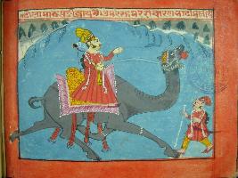 | Description / विवरण | Leaf from illustrated manuscript of Dhola Maru depicting Dhola gong to meet Maru and meta Bhat who describe about Maru s beauty. |