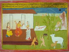 | Description / विवरण | Miniature painting based on Mahabharat - Bhishma parva depicting two child are fighting with sticks while their mother are dancing, which create the earthquake, falling of meteors, cracking of mountain and Rahu going to grasp the sun. |