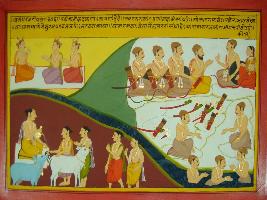 | Description / विवरण | Miniature painting based on Mahabharat - Vana parva depicting Pandavas sitting with Kashayap rishi and Draupadi at upper left part. Below this, they are shown taking bath in river. At the lower right part king is shown giving cow to needy. At the upper right, Indra is depicted sitting with other gods. |