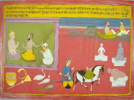 | Description / विवरण | Miniature painting based on Mahabharat - Bhishma parva depicting by hearing about the Kurukshetra war Vyas is coming to meet Dhritrashtra and give Sanjay Divyadisti so that he can narrate the war to Dhritrashtra. Vyas again says that by hearing about war great calamity accures, even the stone statues will laugh at them. |