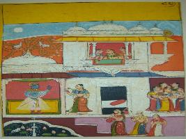 | Description / विवरण | Miniature painting based on Krishna charitra depicting women stepping towards the palace at lower level. Above this Krishna is shown talking to one women at left and on the right part, women are shown wondering, Above this women are shown looking outside from palatial window. It is probably of Rasikpriya. |