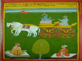 | Description / विवरण | Miniature painting based on Shri Bhagwat Gita depicting Krishna preaching Arjun the knowledge of Gita and telling him that in everybody Narayan is present, one who knows this fact, his life is a success. |