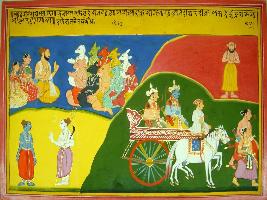 | Description / विवरण | Miniature painting based on Harivansha depicting seated sage with demons at the right upper corner, below them Shiv standing with a Nelpurusha, in the left Indra and Arjun seated on a chariot. |