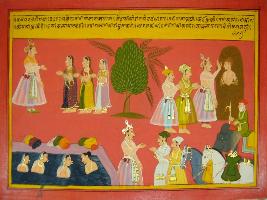 | Description / विवरण | Miniature painting based on Mahabharat - Vana parva. On the upper part a king is depicted with three woman. Three person one king worshipping a god in tree. On the lower part three woman and a man depicted bathing and three man with two horse and one elephant. |