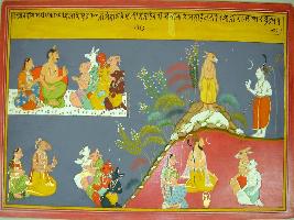 | Description / विवरण | Miniature painting based on Harivansha depicting demon king Bali with his sons on the right upper portion of the painting. In the left he is standing with Shiv and talking to a sage in the lower part. |