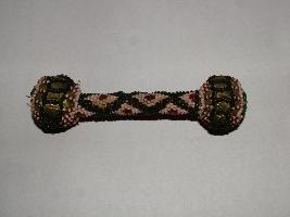 | Description / विवरण | It is a model of a drum-hammer decorated with rhombus design pattern is cylindrical in shape, having black artificial-pearl. |