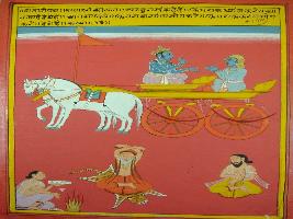 | Description / विवरण | Miniature painting based on Shri Bhagwat Gita. It depicts Krishna preaching Arjun that atma sees everything, no matter how much you meditate and do karma yoga. |
