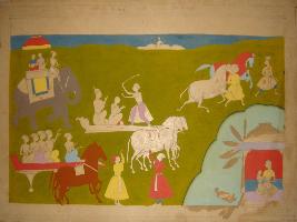| Description / विवरण | Miniature painting depicting Kansa trying to kill Devki after hearing akashwani. Devki and Vasudev is shown sitting with folded hand on chariot at the centre of painting beside them, many Sardars are shown sitting on chariot and elephant. At the lower left, a woman is shown sitting with a child. It is an incomplete painting. |