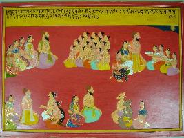 | Description / विवरण | Miniature painting based on Harivansha depicting four sages with their wives and sons and daughters, seated in two rows depicting their genealogical decendancy. |