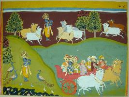 | Description / विवरण | Miniature painting based on Krishna charitra, Krishna is depicting playing his flute and cows and peacocks dancing. He is depicted going back home on bullock cart with some people. |