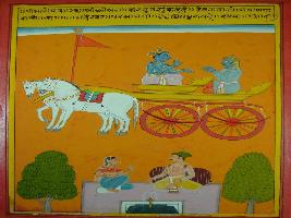 | Description / विवरण | Miniature painting based on Shri Bhagwat Gita. It depicts Krishna preaching Arjun that one who consume Bhogta , Maheshwar, and Parmatma are male. |