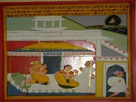 | Description / विवरण | Miniature painting based on Panchtantra depicting that a young woman sat on the bed of old man and same time a thief entered the house for stealing. Then old man said to thief that why he use to steal daily and disturb peoples and later he gave all the money to thief. |