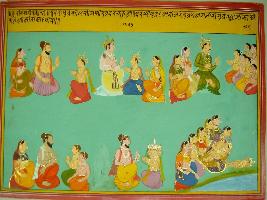 | Description / विवरण | Miniature painting based on Harivansha depicting genealogical decendancy of Dhruv s family. Three sages and two kings are sitting with their wives and sons in two rows. In the extreme left, the child is dead and many females are seen mourning. |