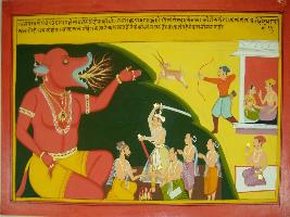 | Description / विवरण | Miniature painting based on Mahabharat - Vana parva. Here it is depicted from a sacrifice a woman is created which is very fat, she has rough lips, earth vibrates when she moves and she has very bad teeth. A large boar headed figure is also depicted here blowing fire from its mouth. |