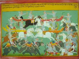 | Description / विवरण | Miniature painting based on Mahabharat - Bhishma parva depicting that in this war everyone is fighting. Father and son are fighting together. Elephants are fighting with elephants and horses are fighting with horses. |