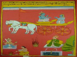 | Description / विवरण | Miniature painting based on Shri Bhagwat Gita. It depicts Krishna preaching Arjun. The person who lives in natural way and perform all natural activities he is having all character good and bad both. |