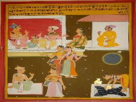 | Description / विवरण | Miniature painting based on Panchtantra depicting two royal male talking to each other in between a female is seeing to one male, a female is seated outside and a male is seated in hut on top left. Below two royal female is shown in dancing pose. Right below a old royal male is saying something to a female and a female is pouring a pot in the tank. |
