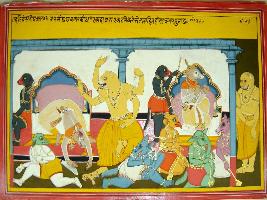 | Description / विवरण | Miniature painting based on Harivansha depicting the court of demon king Hiranyakashyap and Narasimha, the incarnation of Vishnu, killing him and other demons. |