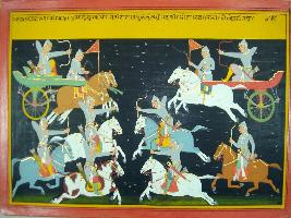| Description / विवरण | Miniature painting based on Mahabharat - Bhishma parva depicting Veerbhadrais fighting bravely and surrounded by elephants, horses and chariots. |