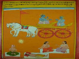 | Description / विवरण | Miniature painting based on Shri Bhagwat Gita. It depicts Krishna preaching Arjun that there is reason for everything that happen in nature. Person get happiness of sorrow that too is because of some reason. |