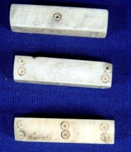 | Description / विवरण | Ivory dice three in number, rectangular in shape having incised circles on it. |