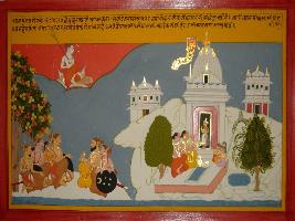 | Description / विवरण | Miniature painting based on Mahabharat - Vana parva depicting Pandavas are coming to Pushkar. They are shown sitting at the lower right part. At the left part, sages are shown worshipping in temple. At the upper right part, Shiv is depicted sitting. |