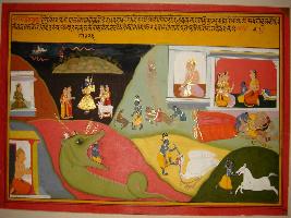 | Description / विवरण | Miniature painting based on Krishna charit - Sur Sagar depicting Rag Billa Kalla, Ragini of Rag Hindol. Surdas is depicted with Manjeera in his hand and narrating Krishna Lila. Nand is depicted sitting in his house at upper left. To its left, Krishna is shown sitting with Yashoda with other Gwalins. Below this, Bal Krishna is shown fighting and killing demons such as Putana, Bakasur, Kesi. At the lower middle part Krishna shown sitting inside the mouth of Kalila Nag. Above this, he is shown carrying Govardhan. |