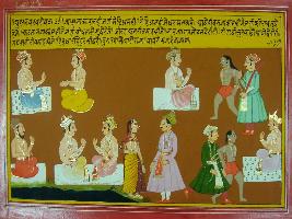 | Description / विवरण | Miniature painting based on Mahabharat - Udyam parva. The painting depicts a king and narrator the duties of king towards a criminal to priests, and his family. |