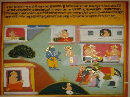 | Description / विवरण | Miniature painting based on Krishna charit - Sur Sagar depicting Rag Kanpho. On the painting Vishnu is seen in the centre and Indra is visible in the right up corner. The painting depicts life style of Devtas. |