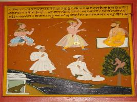 | Description / विवरण | Miniature painting based on Panchtantra depicting the story of crocodiles and monkey. In this painting 4 male is shown in different pose. A thief is shown along with the stolen, monkey is seated on a tree and 3 crocodiles in which 2 crocodiles are shown inside the water and a crocodiles shown in palace. |