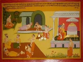 | Description / विवरण | Miniature painting based on Mahabharat - Vana parva. This painting is depicting Jovanashrava shown leaving his kingdom and go to Brihgu rishi s ashram. Brihgu rishi is shown performing yagna in his ashram and had one Kalash with him. kings son come to meet rishi. After he is leaving rishi is shown sleeping. king is shown coming to ashram and drank water from kalash. |