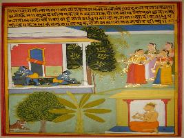 | Description / विवरण | Miniature painting based on Krishna charit - Sur Sagar depicting Rag Bilawal the Ragini of Rag Hindol. In the painting it depicts the childhood activities of Krishna and in the lower part Surdas is been playing Manjeera. |