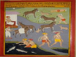 | Description / विवरण | Miniature painting based on Panchtantra depicting frogs are in the pond and two fishermen fishing and Ekbudhi saw the frog. It also depict a donkey who worked whole day for his master. |