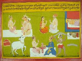 | Description / विवरण | Miniature painting based on Mahabharat - Udyam parva. The painting depicts Sudhan that talking with two man ans says that someboby donate money and someone donate cow while everbody has their duty on a worker work and his life style. |