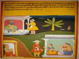 | Description / विवरण | Miniature painting based on Krishna charit - Sur Sagar depicting Rag Malhar, the Ragini of Rag Megh. The painting depict Radha writing a letter to Krishna with her friends depicted at the lower left corner . A messenger is giving the letter to cloud and thunder is seen on the sky. At the lower right Surdas is depicted playing Manjeera . |